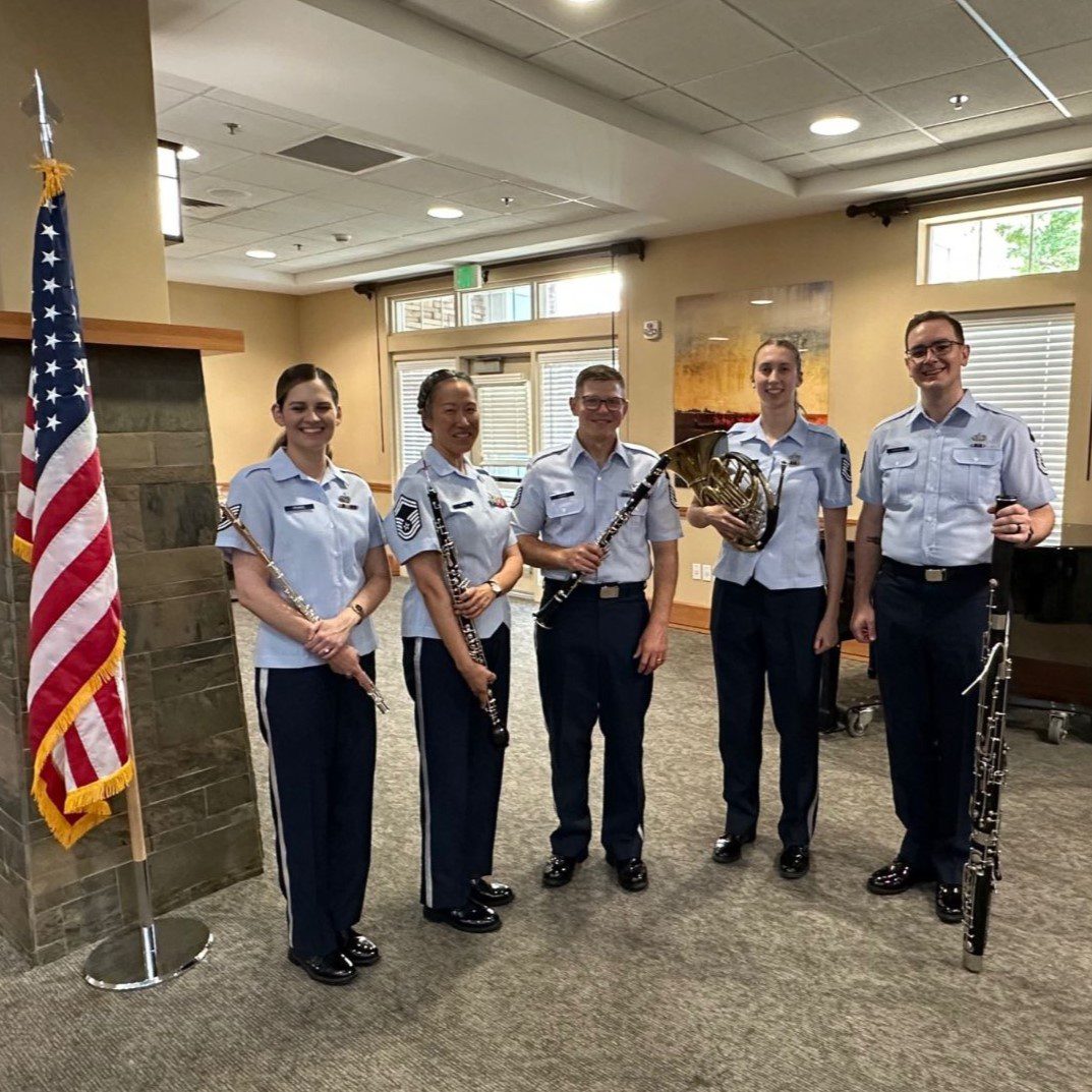 On Sunday, July 27, 2025, the Centennial Room here at Holly Creek Life Plan Community was packed with 130 residents and guests for a special performance by the United States Air Force Academy Rampart Winds. The quintet, part of the United States Air Force Academy Band, brought an engaging and patriotic lineup of “Quintet-essential American Music from the 19th Century to Now,” fulfilling their mission to “honor, inspire, and connect communities”—including Holly Creek.