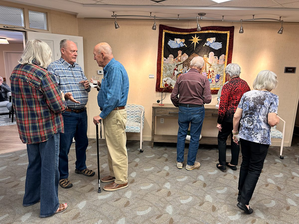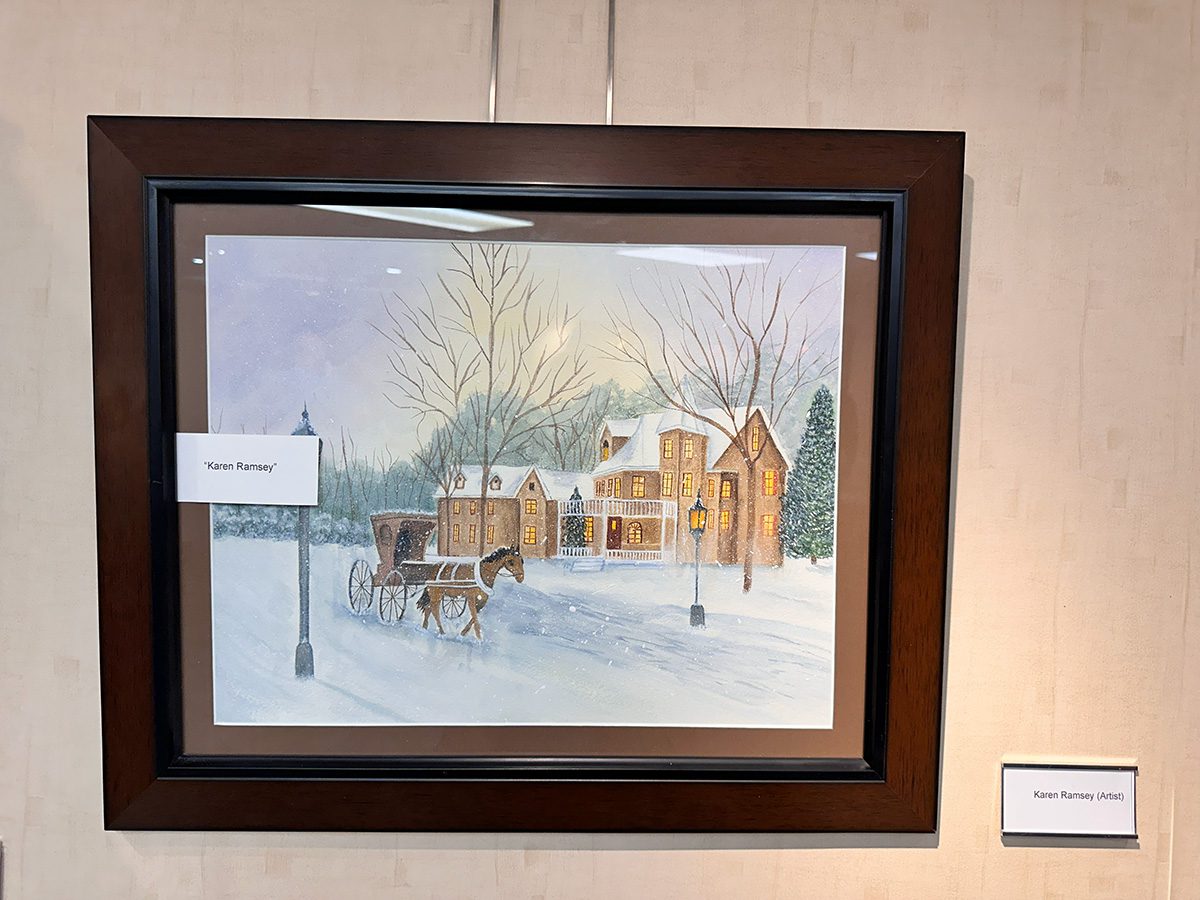 “We love art, and so many of the people in this room are artists. We’ve had a great time changing the art in here every three months,” Artist Interest Group Chairwoman Eve Glesne shared over the microphone to a crowd of around 40 residents at the reception. “And this is our holiday display.”