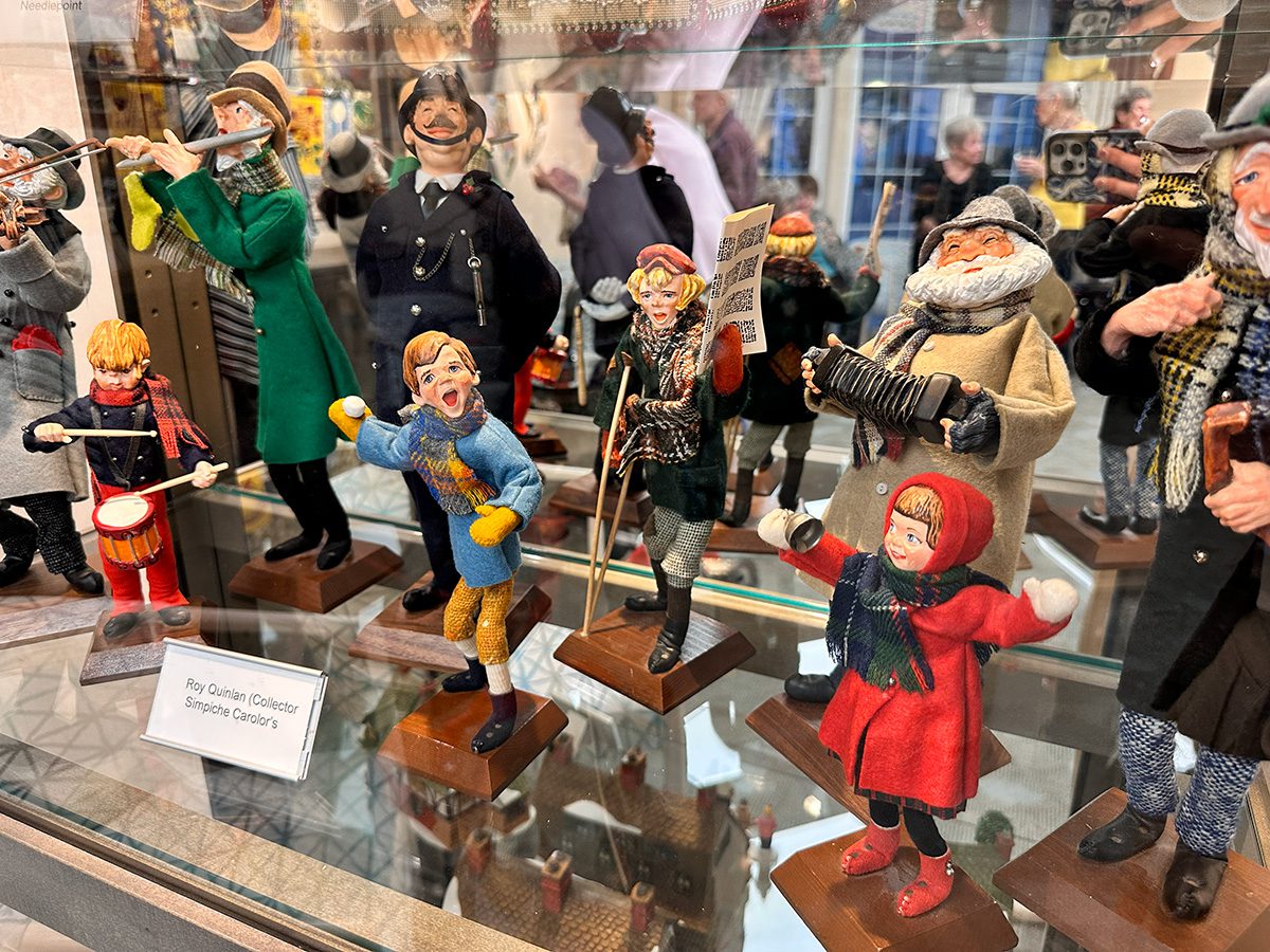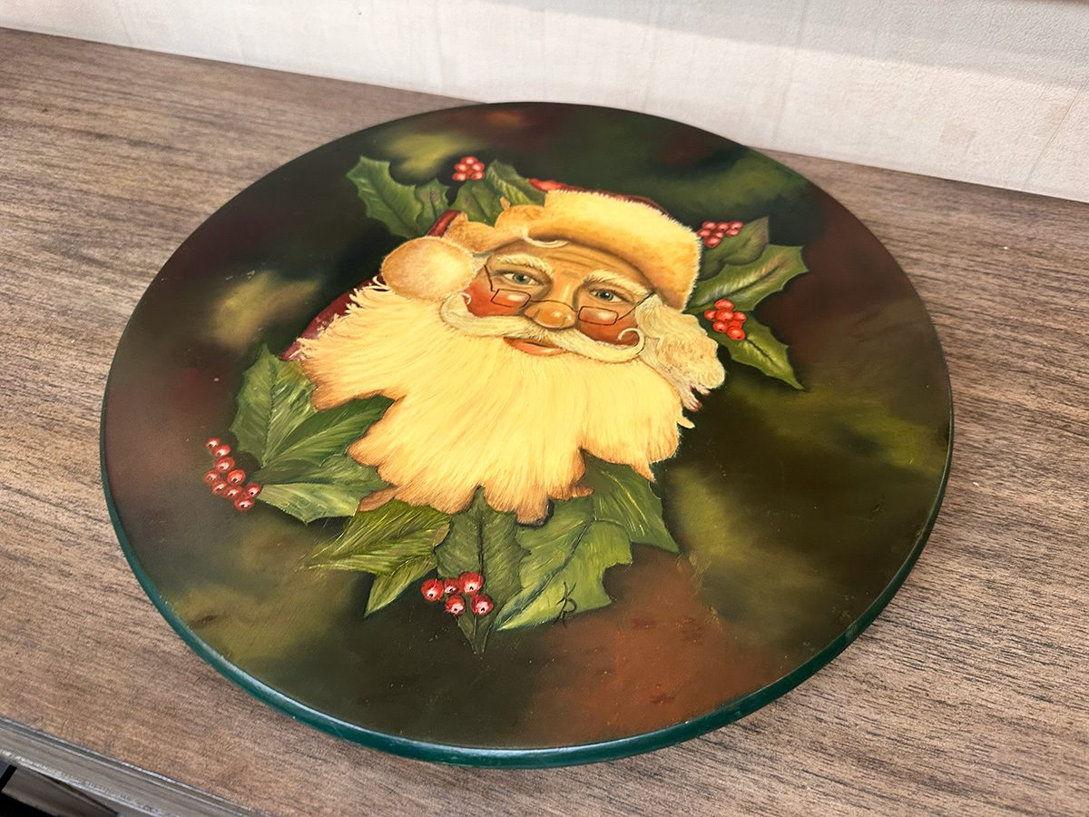 Part of what makes this exhibit so special is the variety of artists and mediums. The holiday exhibit includes everything from quilts and needlepoint stockings to wreaths, wall art and ornaments. Some artists, like Karen Ramsey, have pieces in multiple mediums. Her Twelve Days of Christmas ornaments were carefully hand-painted, and her snowy wall paintings of a sleigh and a large house behind a horse-drawn carriage “feel like old fashioned Christmas.” However, her favorite piece at the exhibit is a Lazy Susan she painted with Santa himself.