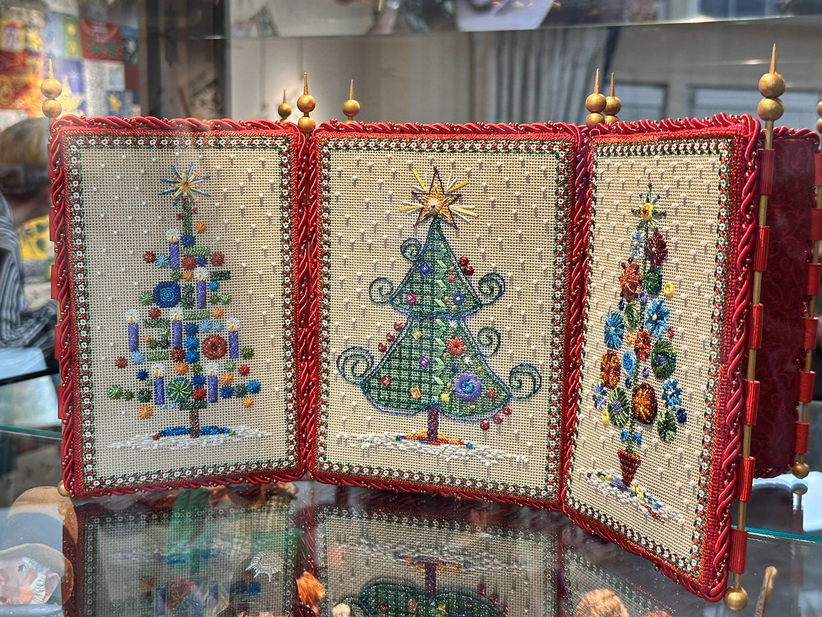 “I have two holiday wall hangings, and I rotate them,” Jeri Couthen explained of her embroidery and appliqué quilt. Couthen estimated that each of the quilt’s 65 blocks took her at least an hour to embroider, not to mention the effort to back and connect the different sizes and colors together for a cohesive piece.